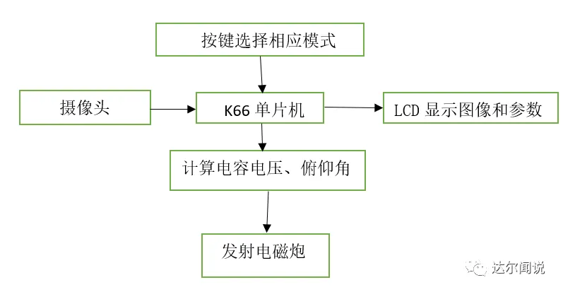 本系统包括MK66FX1M0VLQ18单片机,MT9V032摄像头模块,线圈式电磁炮,升压模块,高压大容量电容,两轴舵机云台,电磁继电器模块。高速摄像头配合单片机实时采集头像,寻找引导标识,在通过激光雷达获取距离,解算发射角度与发射电压,达到最准精度,并设计了简单的人机交互界面,实时调试参数。装置整体结构简洁、系统稳定,能够实现预期任务要求。
