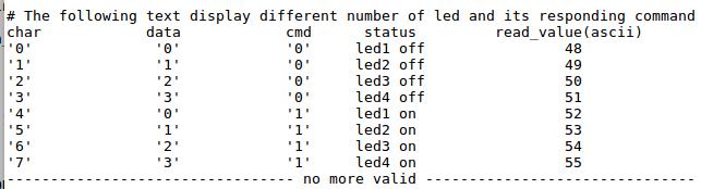 通过应用层程序发送信息,信息由两部分组成,第一部分决定具体LED灯的型号(在这里为LED24),第二部分是控制此型号灯的亮灭,每次通过write函数负责数据发送,read函数来去读取LED灯的状态。这里我列出一个表格,里面标注了每个数值对应的led灯状态。