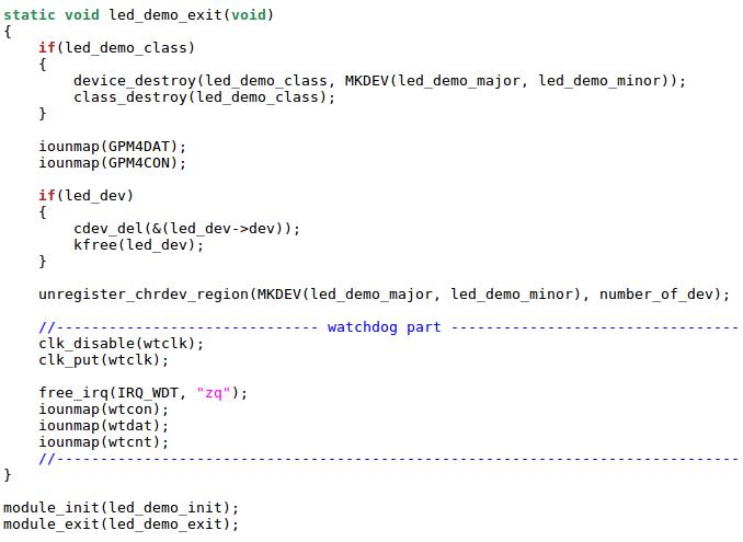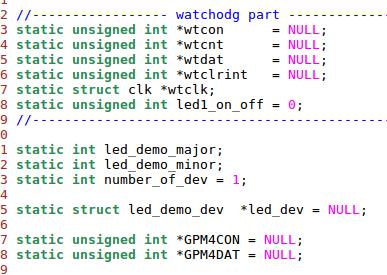 首先定义watchdog和led等的寄存器地址,时钟,主设备号和此设备号,以及设备数量等变量。