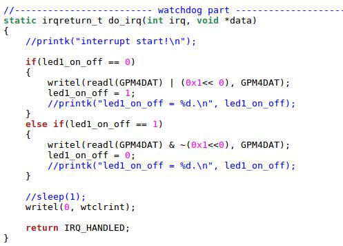 watchdog中断处理函数:由led1_on_off变量值控制led1灯的亮灭,寄存器配置完成后,将led_on_off数值进行翻转,然后清除中断标志(非常重要),等待下一次中断的到来。