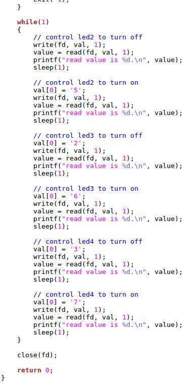 第二部分是通过write和read函数配置寄存器,以实现led2led4灯的亮灭。从硬件角度理解的话,不同的寄存器可以被硬件读取实现的不同行为,将软硬件层合作实现嵌入式开发的步骤清晰展示出来。