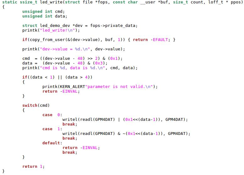 应用层程序:打开驱动设备后,分别使用write和read函数写入和读取设备。