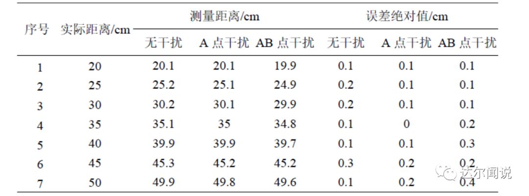 情况一:AB 点无干扰。情况二:由信号发生器产生扫频信号(方波,峰峰值5V,均值0,线性方式,初始频率和终止频率分别为100Hz 和1kHz,扫描时间为100ms),并接入A 点。情况三:在保留A 点输入上述方波的基础上,再由另一台信号发生器产生扫频信号(初始频率和终止频率分别为1MHz 和10MHz,其它与情况二相同),并接入B 点。三种情况下,短路故障点与A 点(或B 点)的距离测试结果见下表。