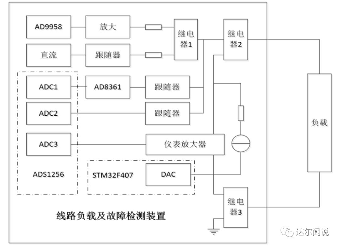 基于上述各模块方案论证,系统总体方案如图1 所示。继电器1 用于切换直流与交流电压(AD9958)输出,继电器2 和3 用于切换恒流源输出。利用ADS1256 三路ADC分别采集负载端直流电压、交流电压真有效值(AD8361)、恒流源电压(短路时使用),两路跟随器将ADC 与负载进行隔离,减少采样电路对测量的干扰。单片机DA 控制恒流源稳定输出,从而测量短路故障时导线上的微弱压降。
