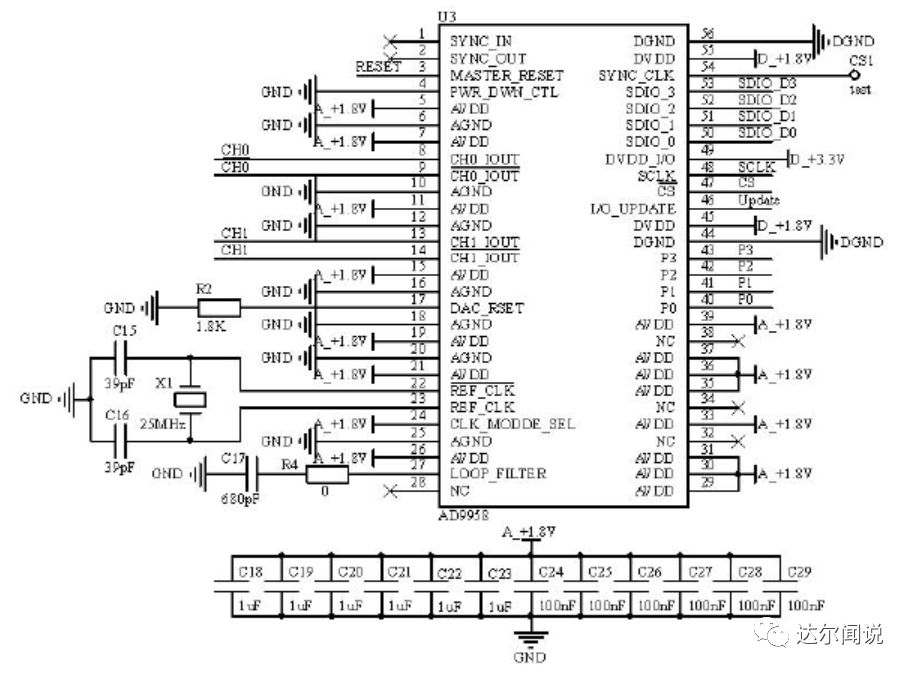 系统扫频信号源采用AD 公司的DDS 芯片AD9958 为核心,首先对AD9958 进行初始化,设置所需主频。然后,AD9958 写入频率控制字、相位控制字、幅度控制字和通道选择控制,以差分方式输出所需频率信号。这里只使用其中一路信号作为扫频源。