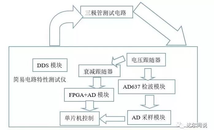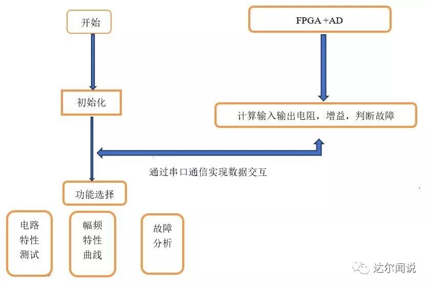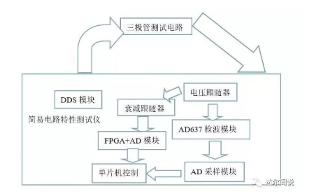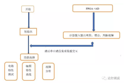 我们的简易电路特性测试系统由三极管待测放大电路、AD637有效值检波电路、以单片机控制的ADS1115模块、AD9959模块以及FPGA控制的24位高精度AD和串口屏显示模块,两路跟随器。DDS产生信号输入三极管待测电路,放大电路输出通过并联电阻送入高精度AD模块进行采集,最终由FPGA对数据处理,计算待测电路输入输出电阻,增益等;用DDS模块为信号源产生扫频信号对电路的幅频特性进行进一步的测量。在发挥部分,FPGA通过对输入输出信号进行FFT,得到了输入相对于输出信号精确的相位变化和增益变化,通过这些变化的值,来判断出电路的故障。