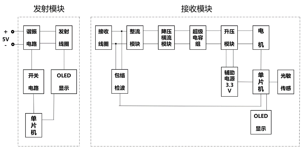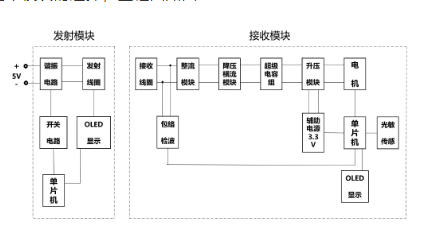 系统总方案 ,主要由无线发射模块、接收模块、电机驱动模块、超级电容组、恒流充电模块组成。