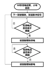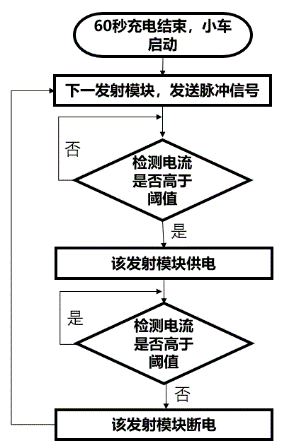 根据题目发挥部分要求,在接通电源,计时60秒后,小车自行启动,沿导线单向不停顿行驶,沿途有4个发射线圈轮流动态充电。为了小车行驶尽量长的距离的同时,耗费更少的能量,以使指标K=L2/W达到最优。本作品在60秒自启动后,由单片机控制下一个发射线圈发射脉冲信号,当小车接近时,检测到电流大于阈值,则完全打开此发射线圈。当小车完全经过后,检测到电流小于阈值,再次控制下一线圈发射脉冲信号,以此完成循环检测,动态充电。