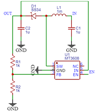 电容的放电:经过多次实验及测试,针对整个系统,采用2.7V、10F超级电容两个并联后,再三组并联。因为电容储存能量与电容两端电压正相关,所以需要在电容两端电压较低时,利用BOOST升压电路,将电压升至足以驱动电机,为此我们选择了MT3608升压芯片,将输出端作为芯片的供电,理论上可将电容中0到6V均转为8V给电机供电,但由于芯片内部开关管内阻等原因,实际应用中仅能利用0.6到6V中的电能,可利用电容中90%的能量。
