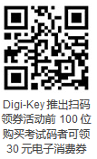 Digi-Key 除了作为该项目的战略推广合作伙伴,还为前 100 位购买考试码者提供 30 元京东 (JD.com) 电子优惠券。工程师可以通过二维码购买考试存取码,并在Digi-Key 官方微信账号进行注册。我们将按照先到先得原则发放电子优惠券。