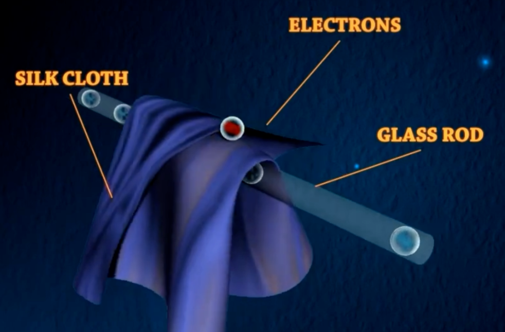 当两件不同的物体发生接触时,两者之间会形成负电荷“夺取侧”与“被夺取侧”的关系。一方所带的负电荷会移动到负电荷吸引力更强的另一方,被夺取负电荷的物体将带有更多的正电荷,夺取负电荷的物体将带有更多的负电荷, 例如,当玻璃和棉布接触的时候,玻璃就带正电,棉布就带负电,这种平衡被破坏的状态,就被称为“静电”,将带有静电的状态称为“带电”。