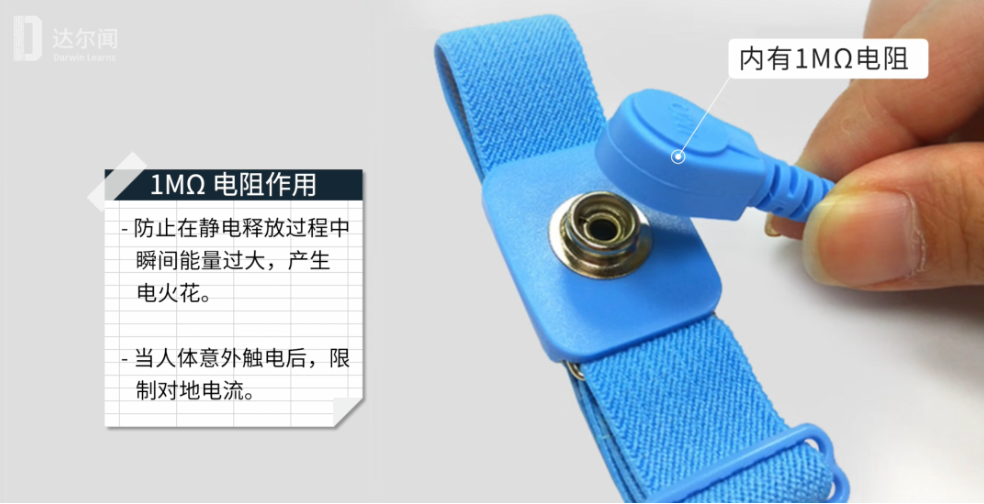 没错,通过金属片和线,是真真实实的连接到大地上了。主要有两个作用,一是防止在静电释放过程中瞬间能量过大,产生电火花,二是当人体意外触电后,限制对地电流。没想到,有线静电手环竟是如此简单。