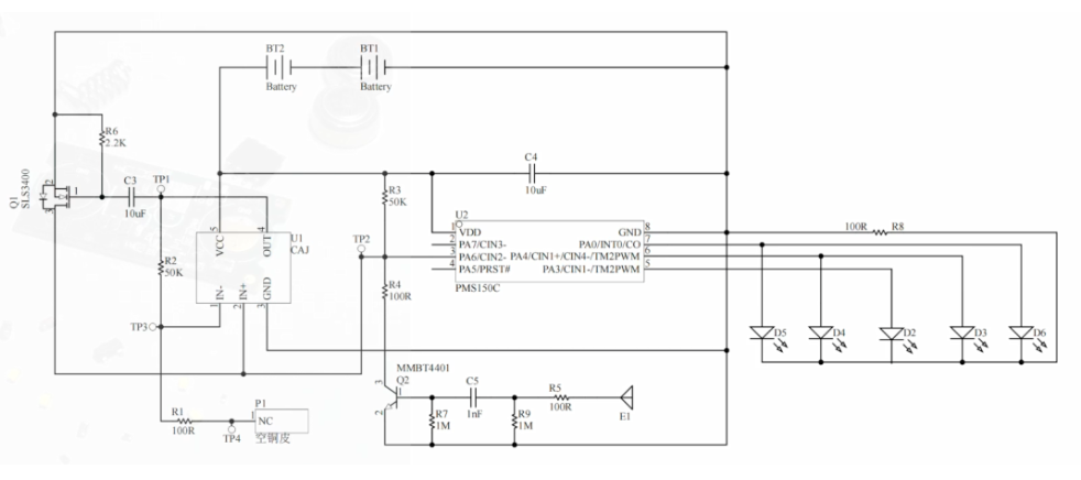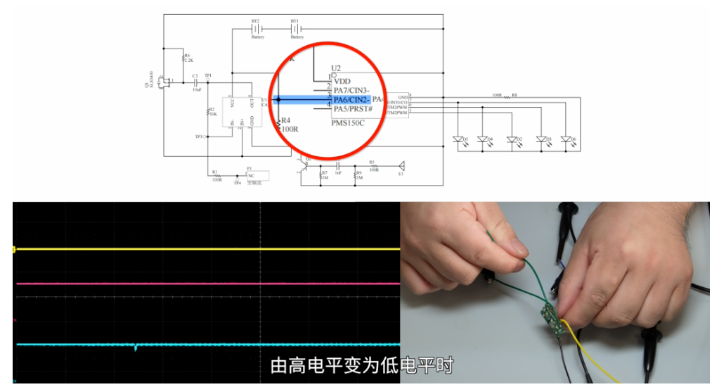 E1是接触人体的触片,U2是一颗8位单片机,U1是一颗运放,Q2是一个NPN三极管,Q1是一个NMOS,供电是2颗1.5V的纽扣电池。我们使用示波器监测TP1-TP3的电平变化,当单片机的PA6电平由高电平变到低电平时,LED会亮,亮灯顺序是LED2—>LED3、LED4—>LED5、LED6,展示出来的效果就是从中间流动到两边,每触发一次,LED灯会流动一次,所以,这个单片机的作用炫酷的指示。